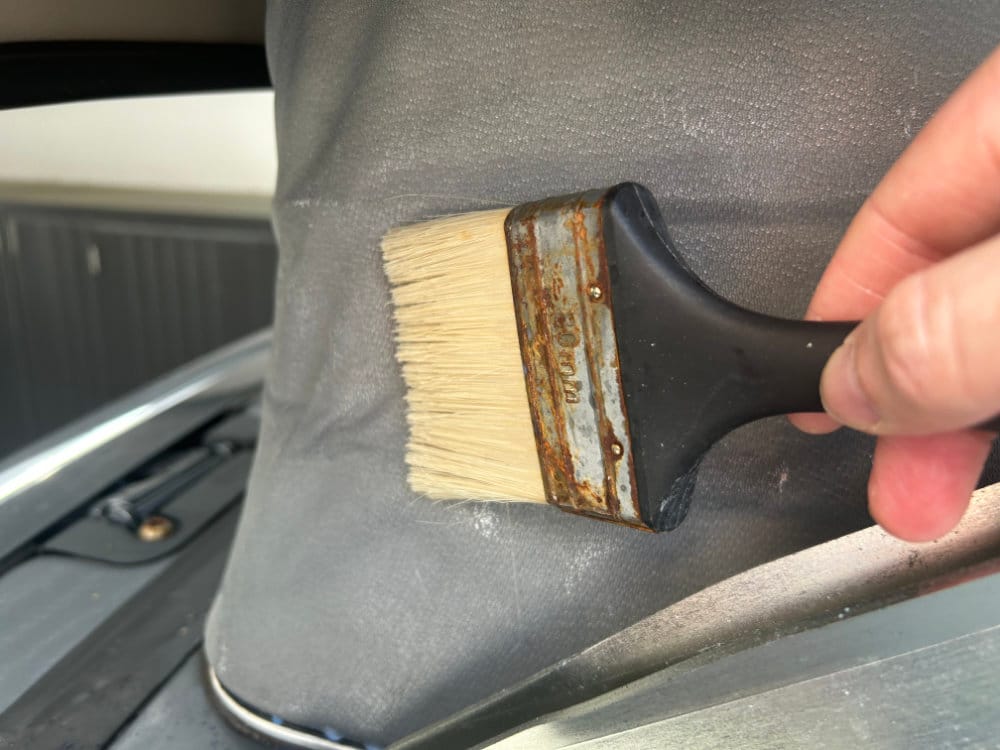 Ensuite, j'ai appliqué l'imperméabilisant généreusement au pinceau, en repassant plusieurs fois sur chaque zone jusqu'à voir le produit bien s'imprégner dans les fibres de la toile.